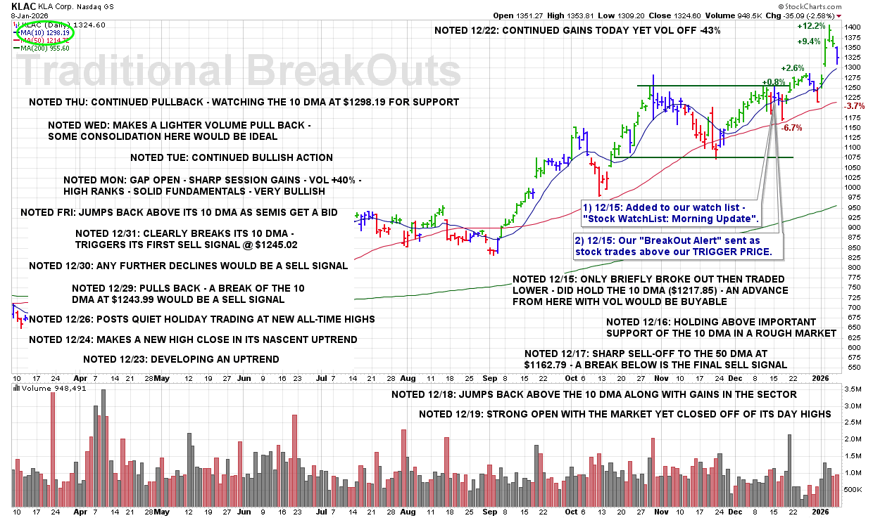 THU 1/8: KLAC – Continued Pullback – Watching the 10 DMA at $1298.19 for Support