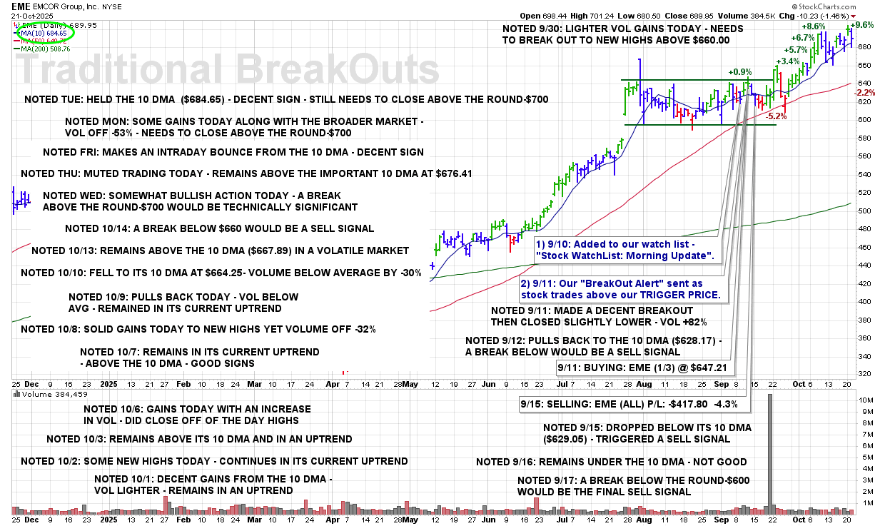 TUE 10/21: EME – Held the 10 DMA ($684.65) – Decent Sign – Still Needs to Close Above the Round-$700
