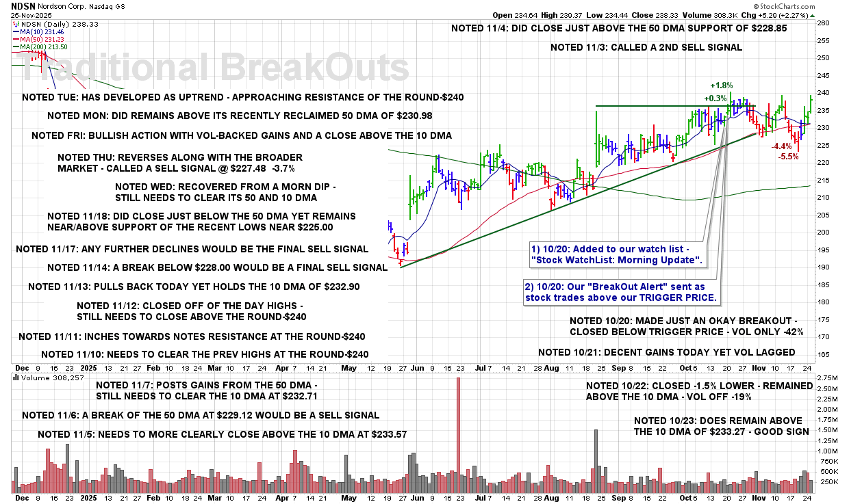 TUE 11/25: NDSN – Has Developed as Uptrend – Approaching Resistance of the Round-$240