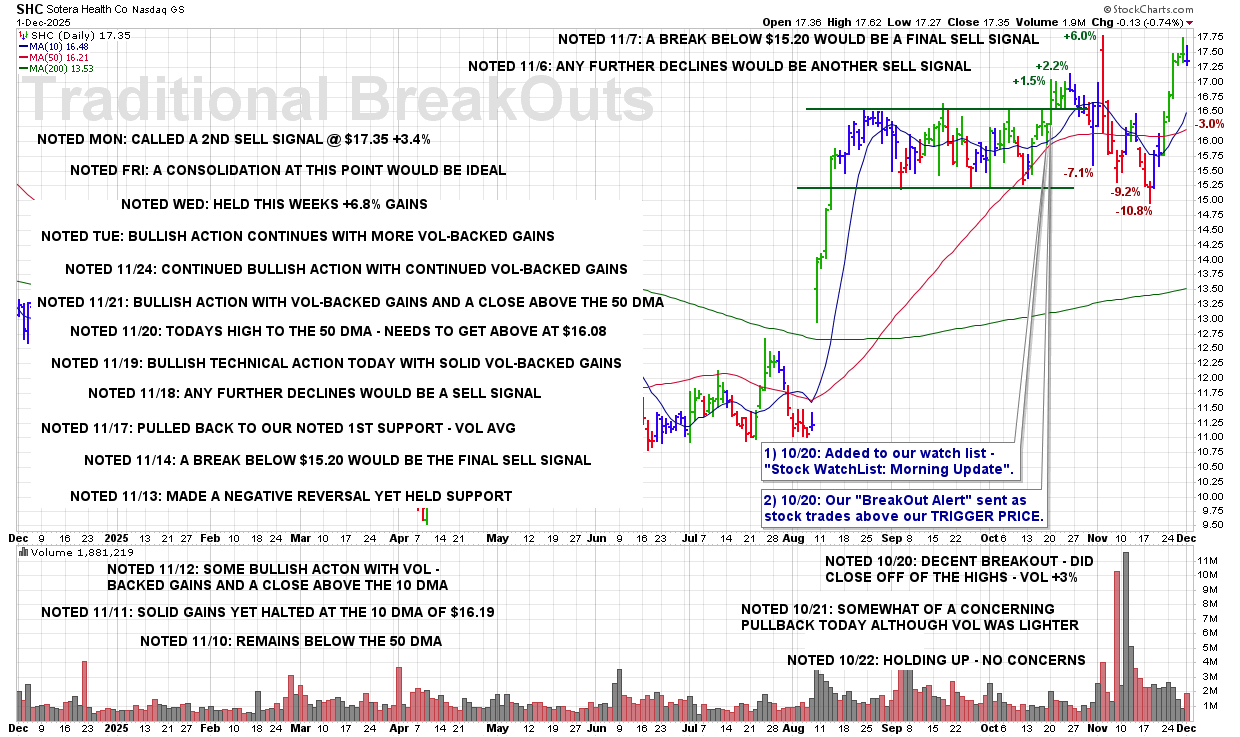MON 12/1: SHC – Called a 2nd Sell Signal @ $17.35 +3.4%