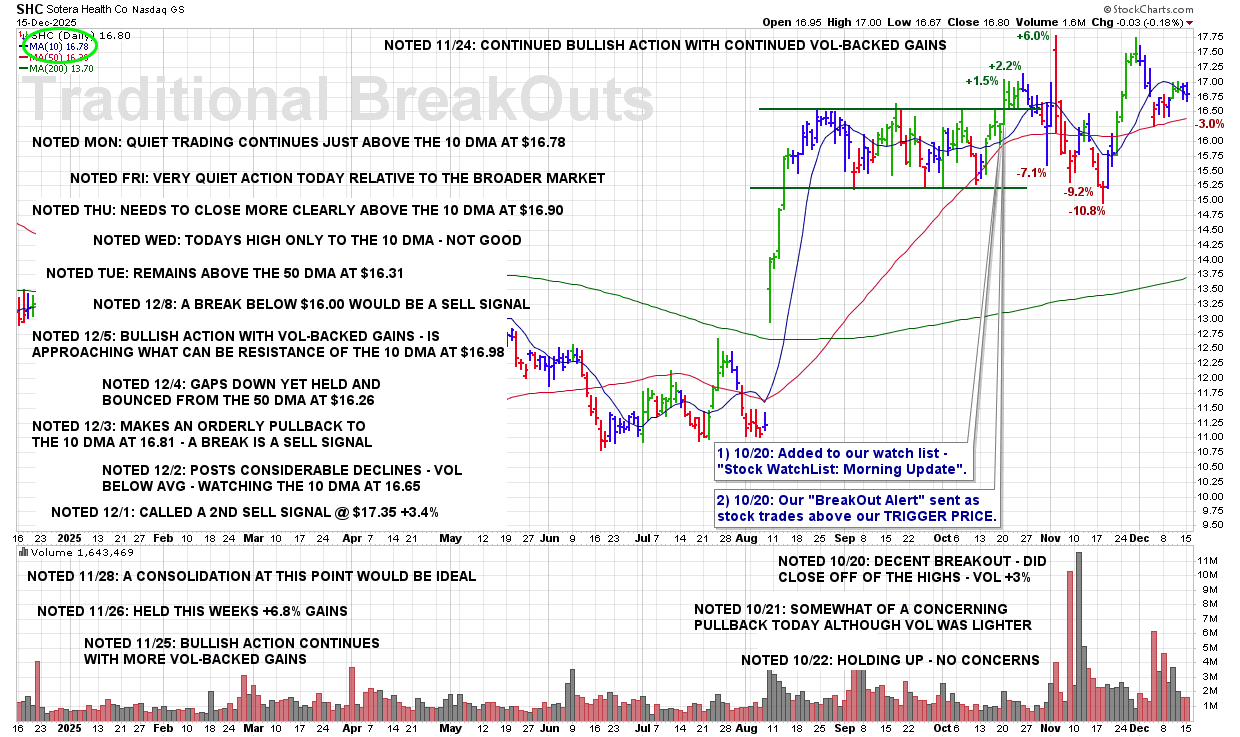 MON 12/15: SHC – Quiet Trading Continues Just Above the 10 DMA at $16.78