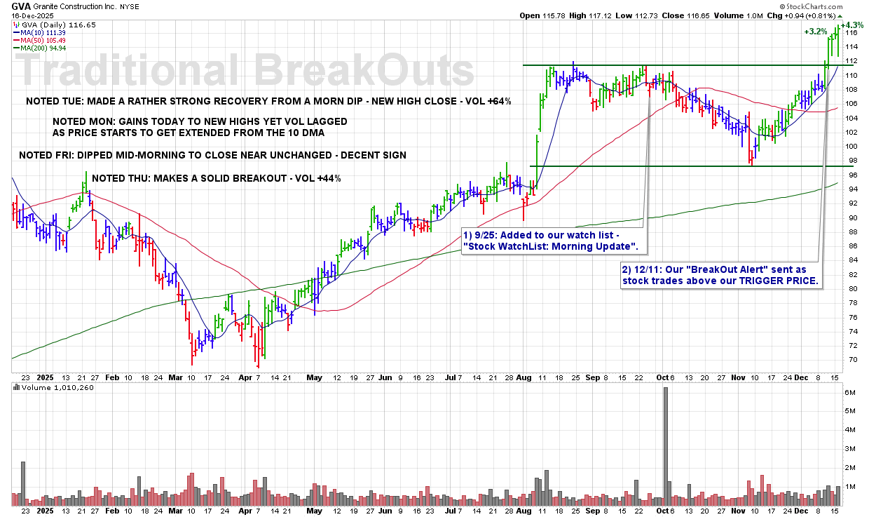 TUE 12/16: GVA – Made a Rather Strong Recovery From a Morning Dip – New High Close – Volume +64%