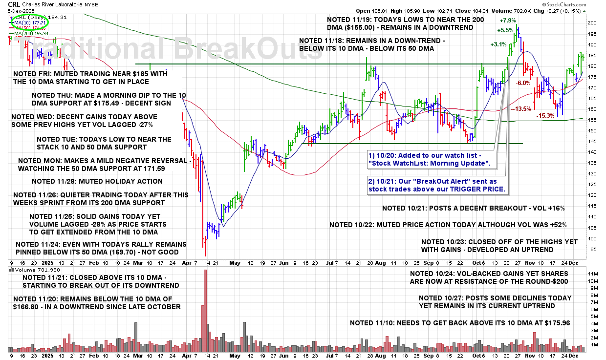 FRI 12/5: CRL – Muted Trading Near $185 with the 10 DMA Starting to Get in Place
