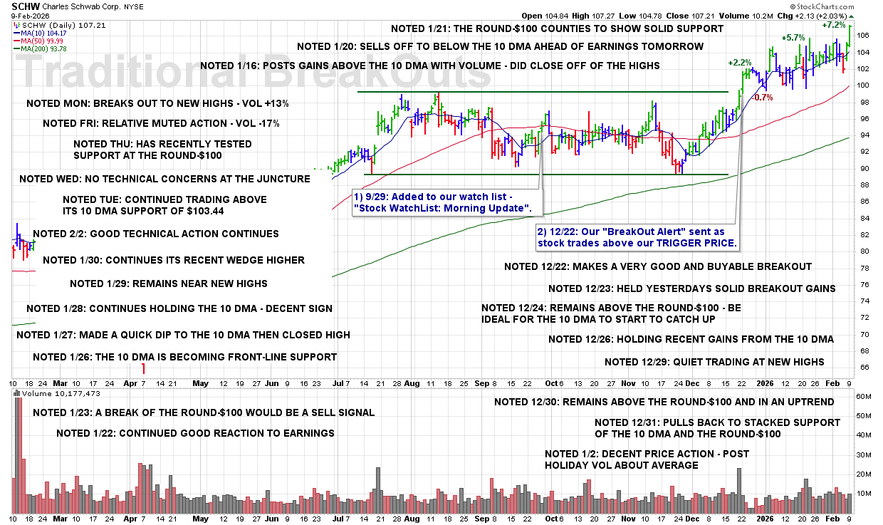 MON 2/9: SCHW – Breaks Out to New Highs – Volume +13%
