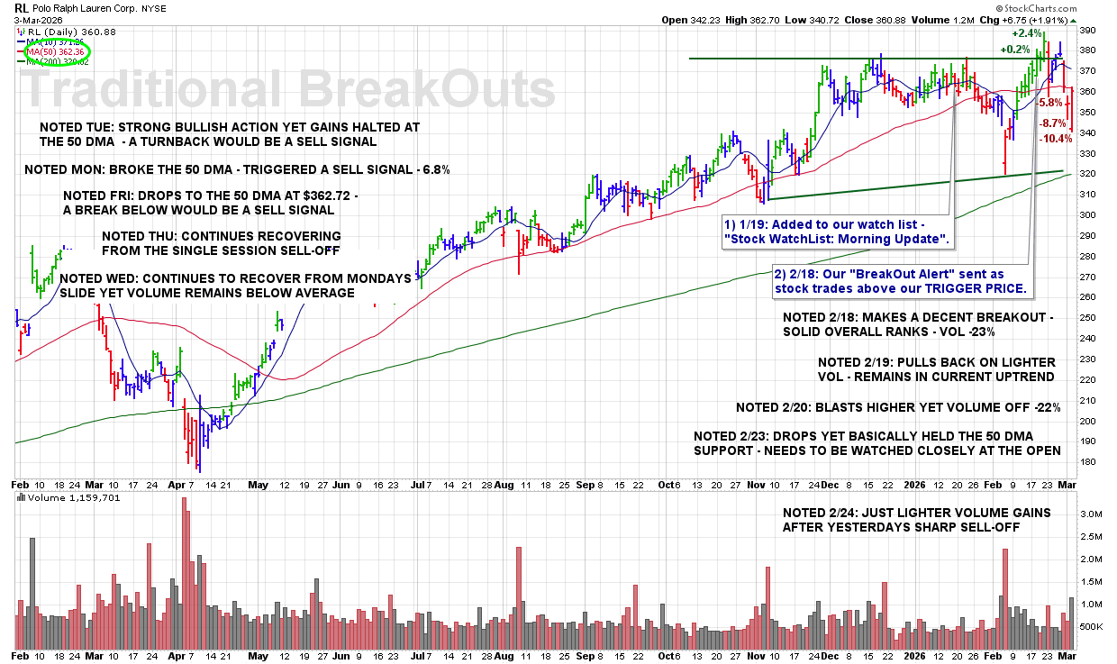 TUE 3/3: RL – Strong Bullish Action Yet Gains Halted at the 50 DMA – a Turnback Would Be a Sell Signal