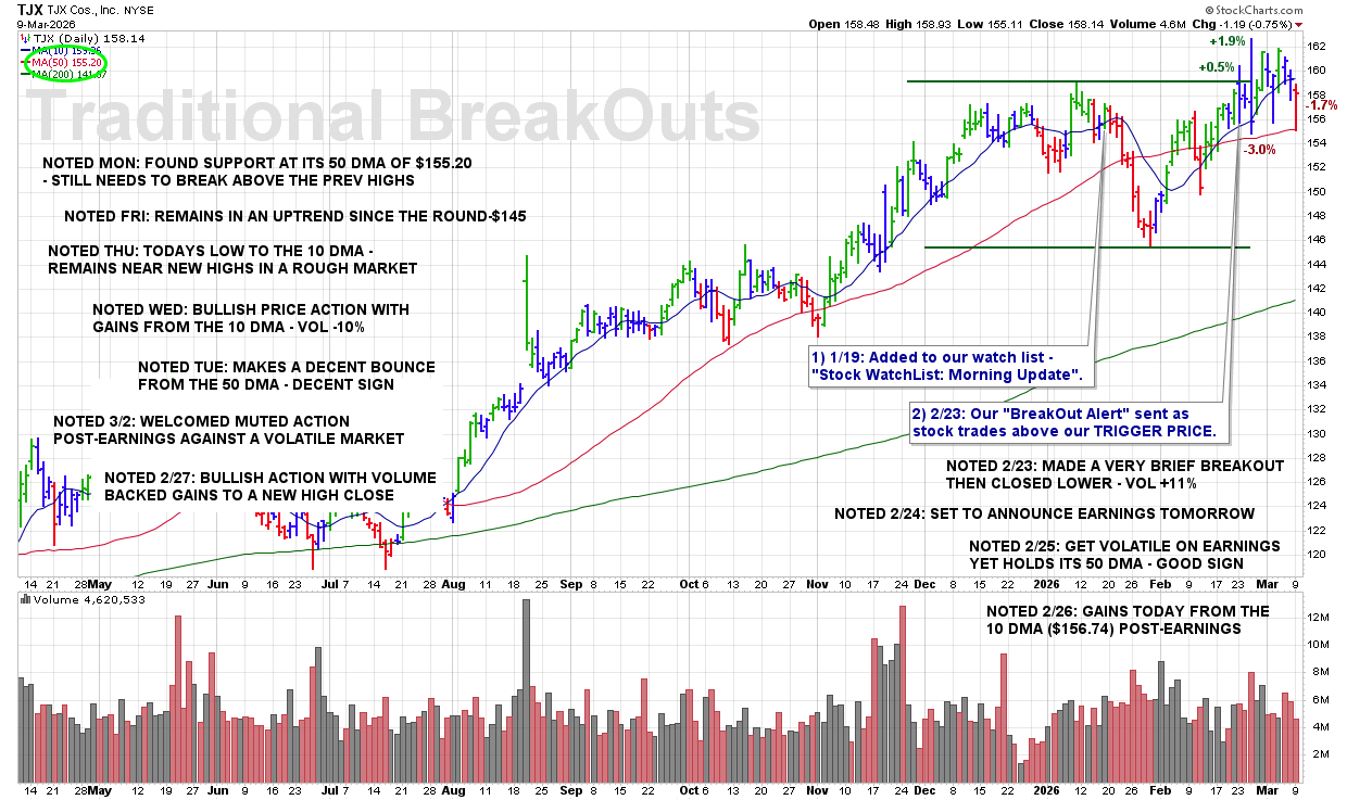 MON 3/9: TJX – Found Support at Its 50 DMA of $155.20 – Still Needs to Break Above the Previous Highs