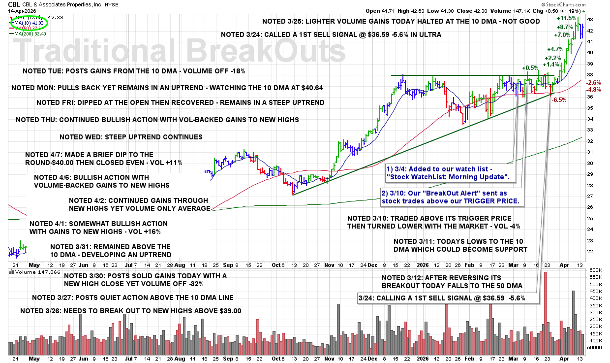 TUE 4/14: CBL – Posts Gains From the 10 DMA – Volume Off -18%