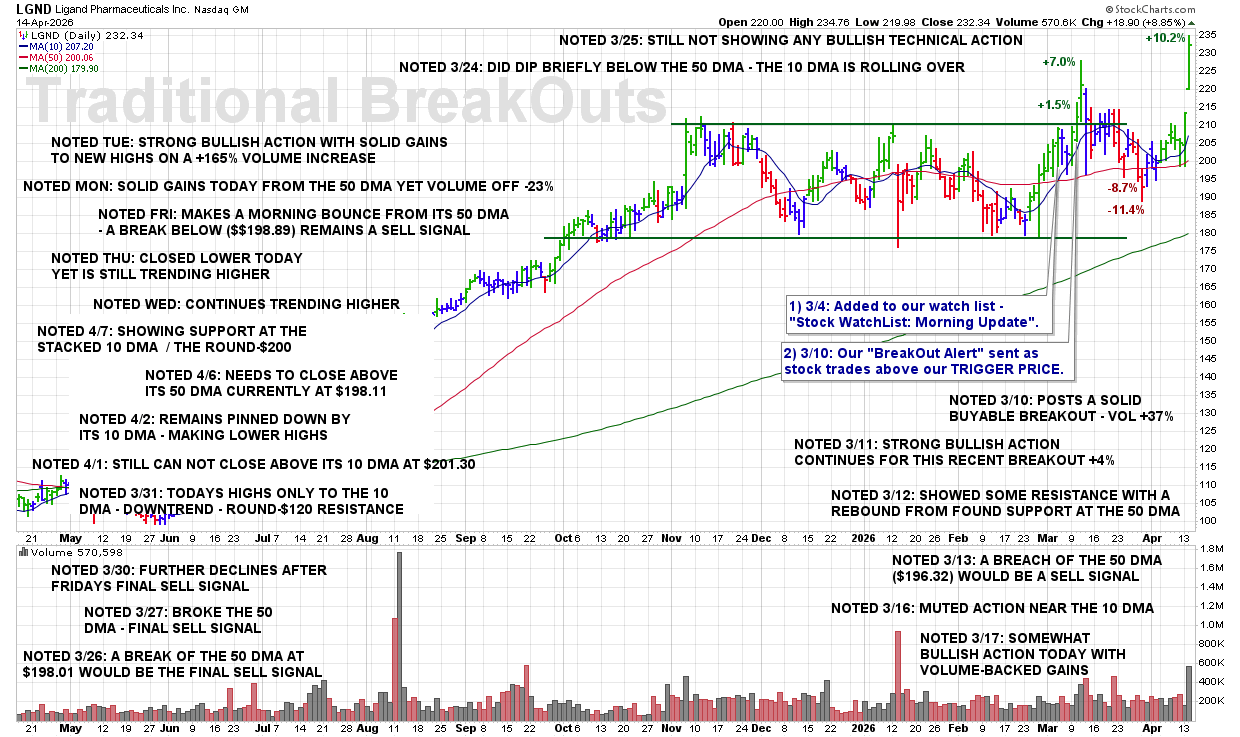 TUE 4/14: LGND – Strong Bullish Action With Solid Gains to New Highs on a +165% Volume Increase