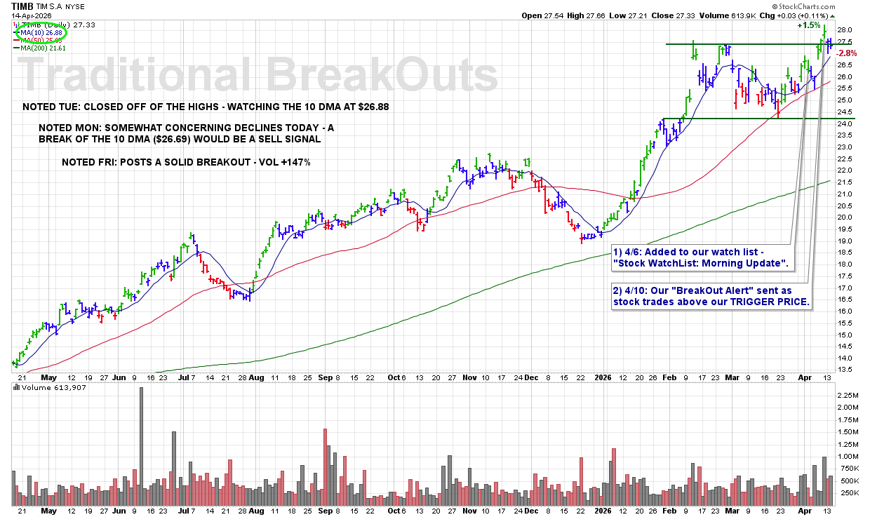TUE 4/14: TIMB – Closed Off of the Highs – Watching the 10 DMA at $26.88