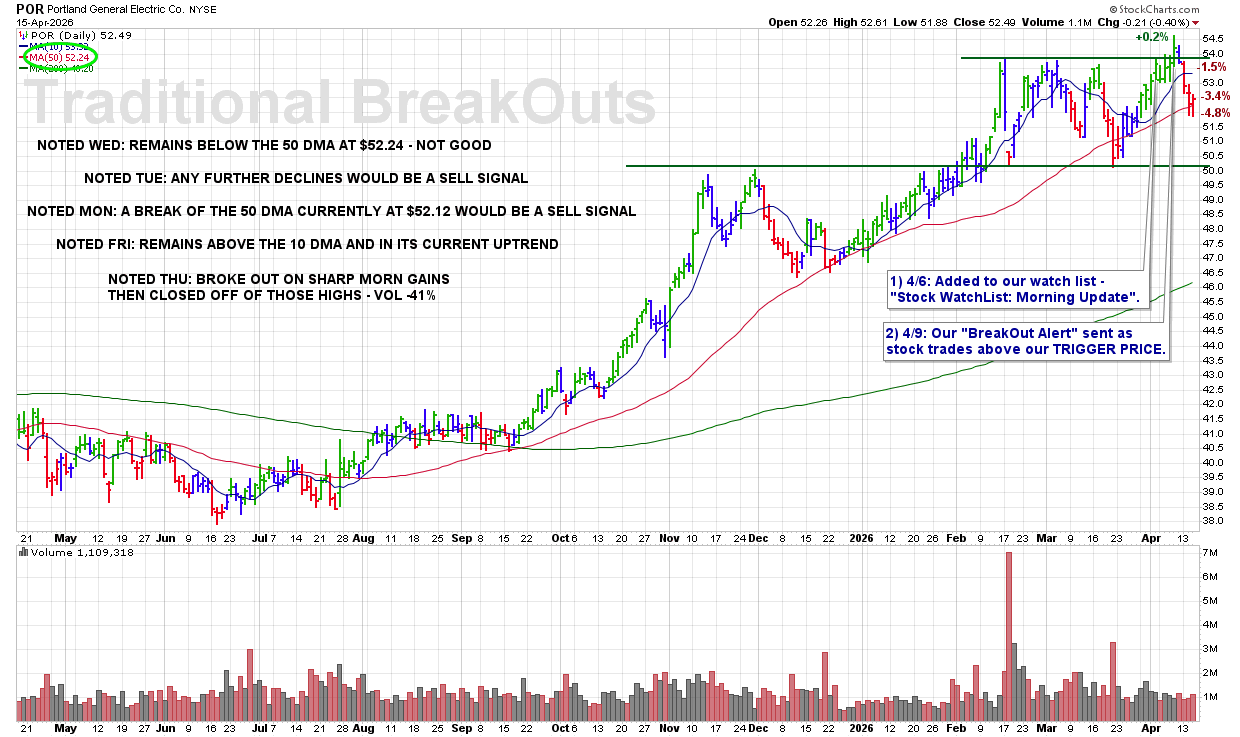 WED 4/15: POR – Remains Below the 50 DMA at $52.24 – Not Good