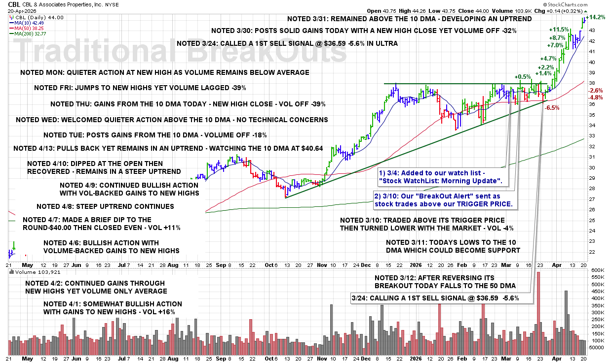 MON 4/20: CBL – Quieter Action at New High as Volume Remains Below Average