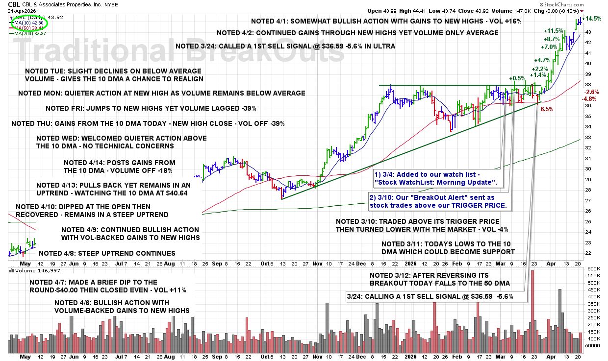 TUE 4/21: CBL – Slight Declines on Below Average Volume – Gives the 10 DMA a Chance to Realign