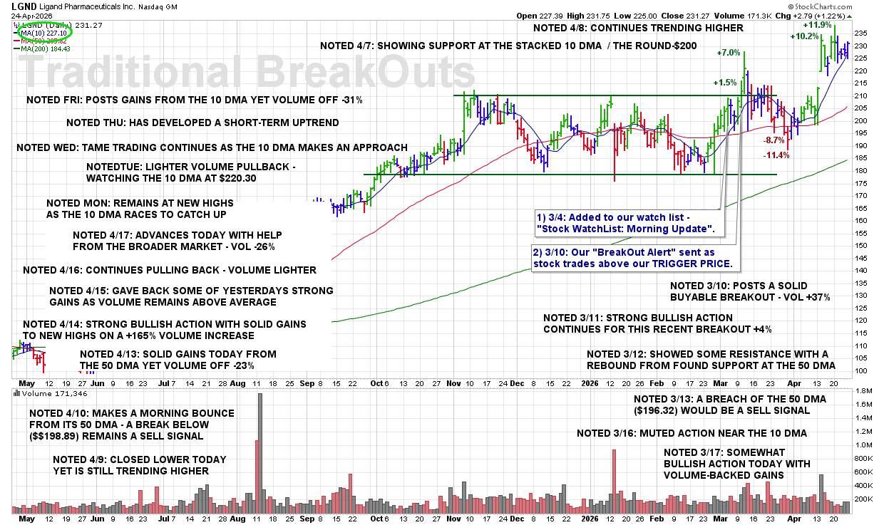 FRI 4/24: LGND – Posts Gains From the 10 DMA Yet Volume Off -31%