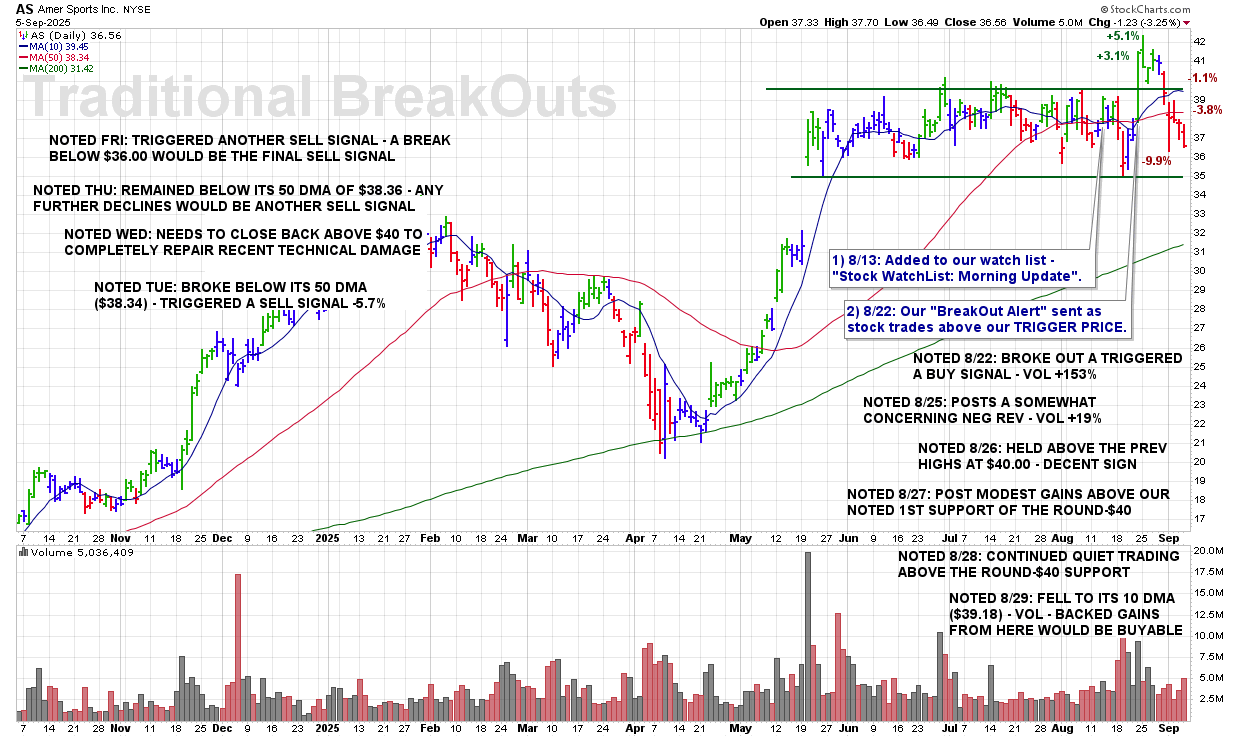 FRI 9/5: AS – Triggered Another Sell Signal – A Break Below $36.00 Would Be The Final Sell Signal