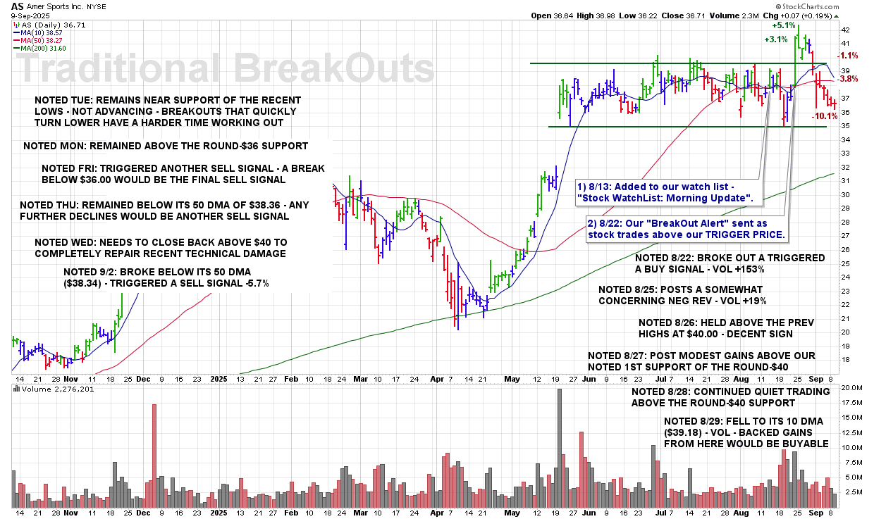 TUE 9/9: AS – Remains Near Support Of The Recent Lows – Not Advancing – Breakouts That Quickly Turn Lower Have A Harder Time Working Out