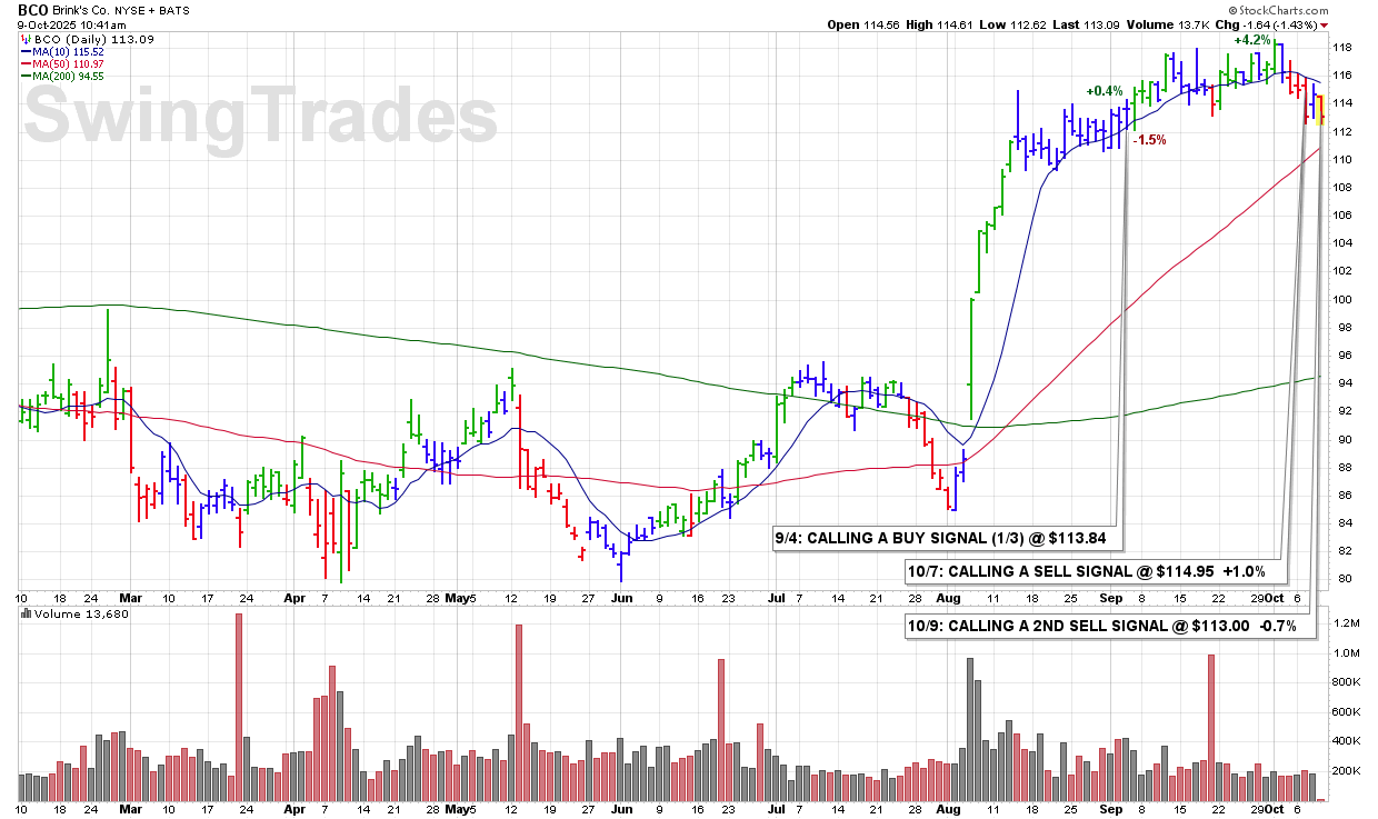 THU 10/9: BCO – CALLING A 2ND SELL SIGNAL @ $113.00 -0.7%