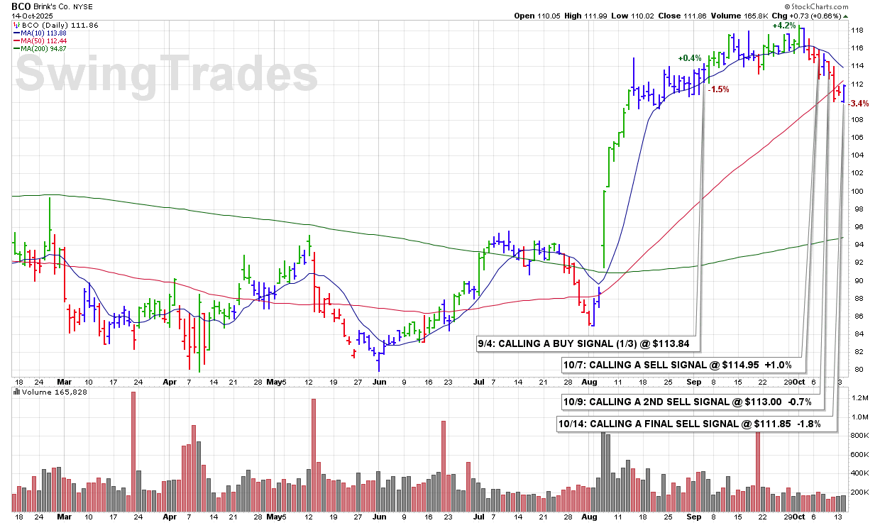 TUE 10/14: BCO – CALLING A FINAL SELL SIGNAL @ $111.85 -1.8%