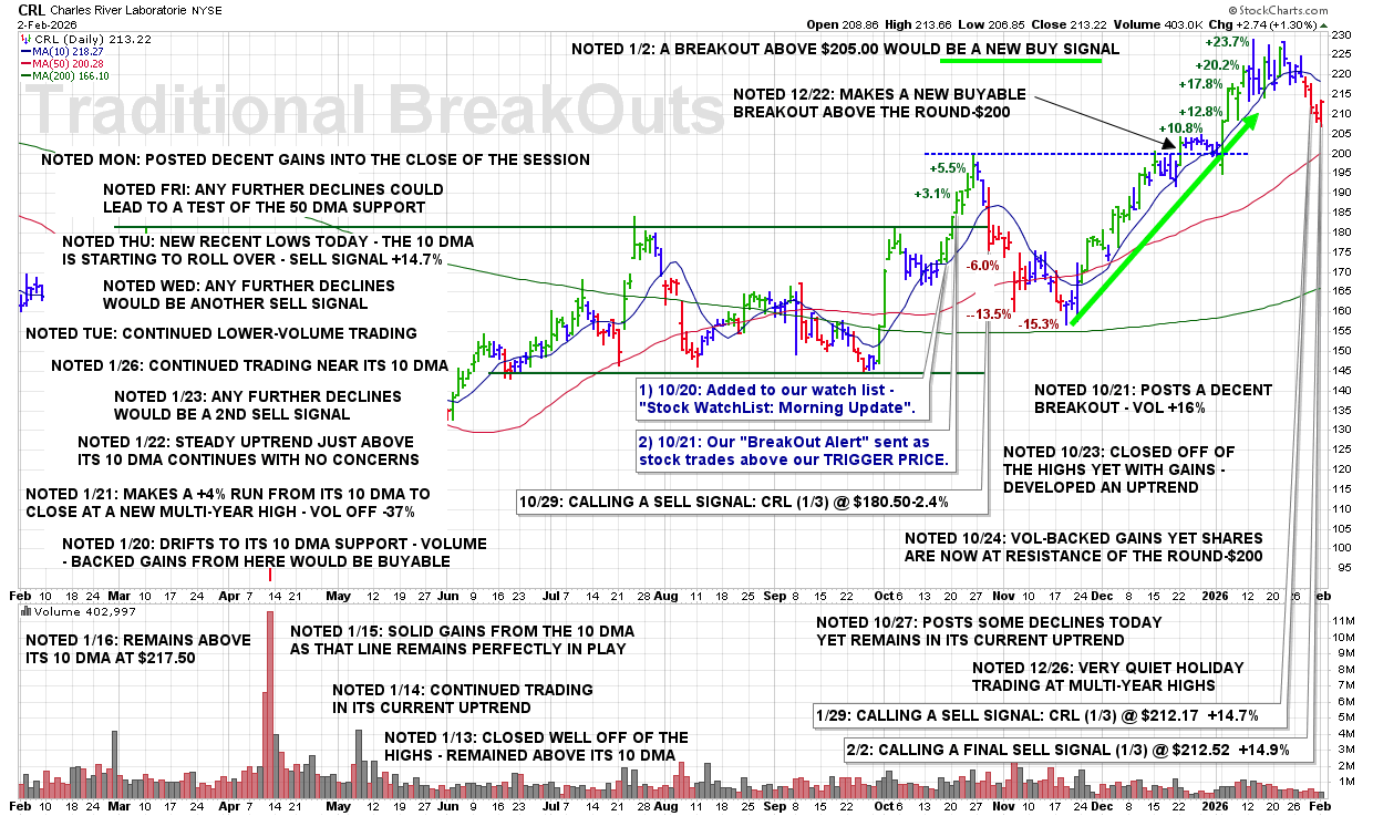 MON 2/2: CRL – CALLING A FINAL SELL SIGNAL @ $212.52 +14.9%