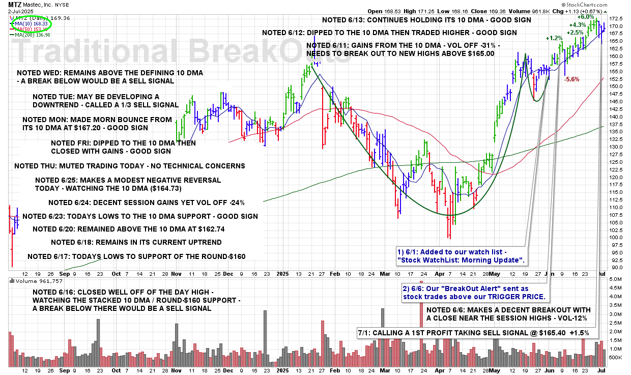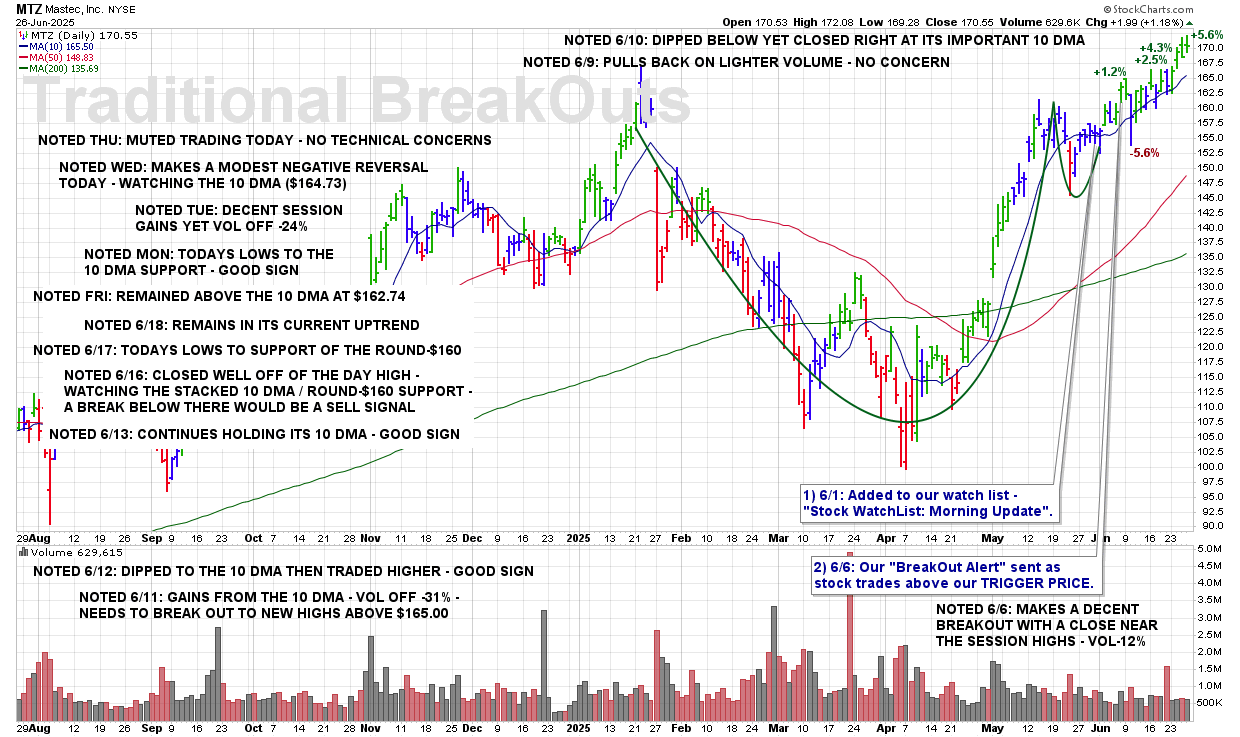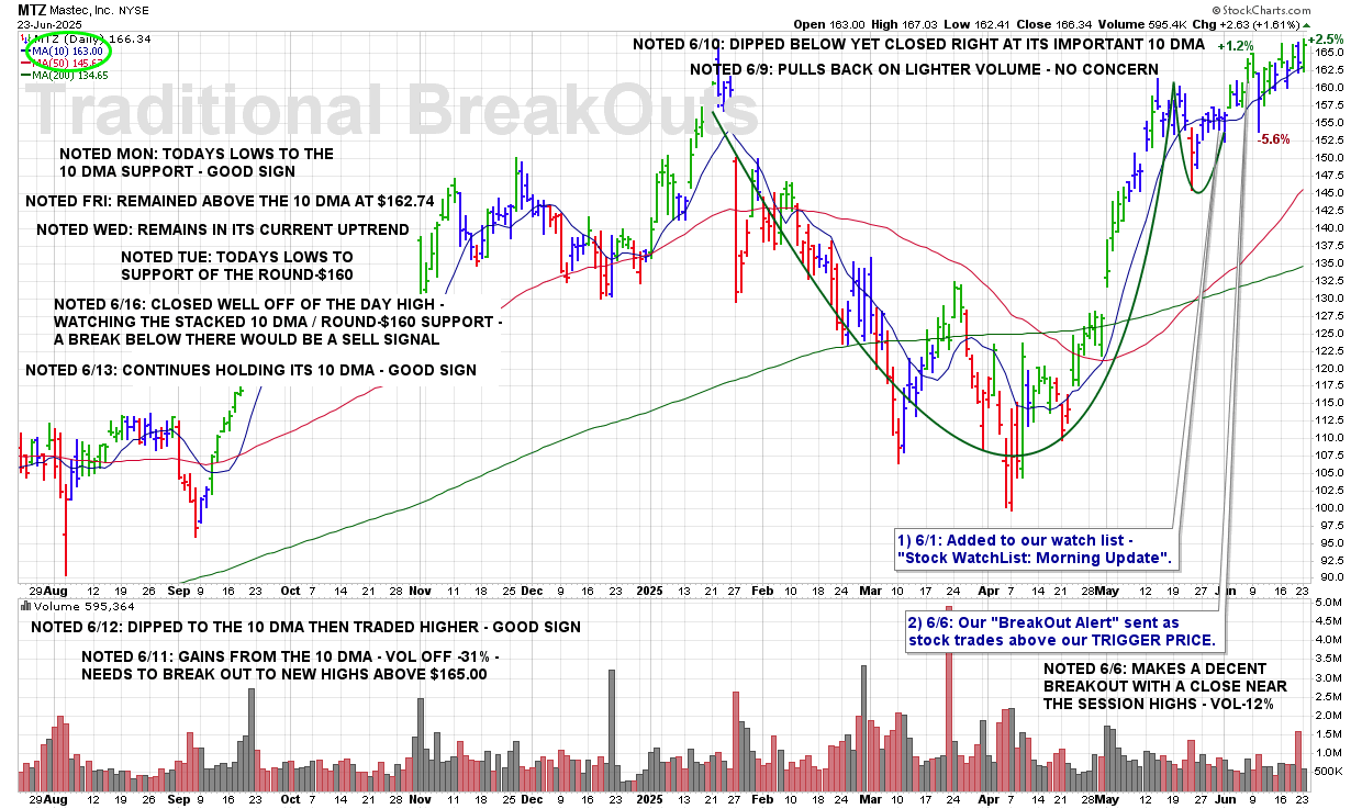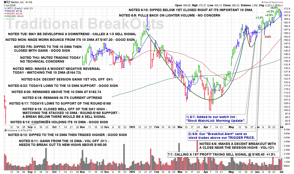 TUE 8/19: MTZ – A Break Of The 50 DMA ($173.95) And This Stock Will Be Removed From Coverage