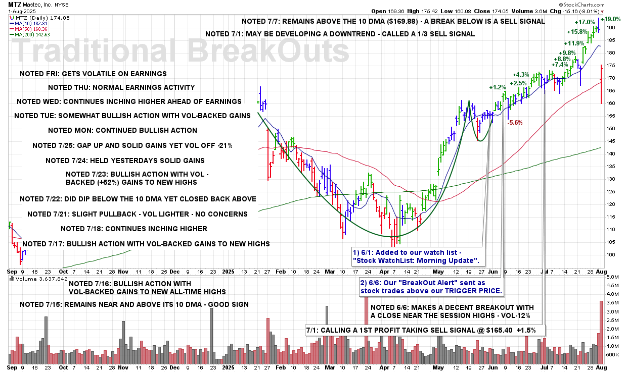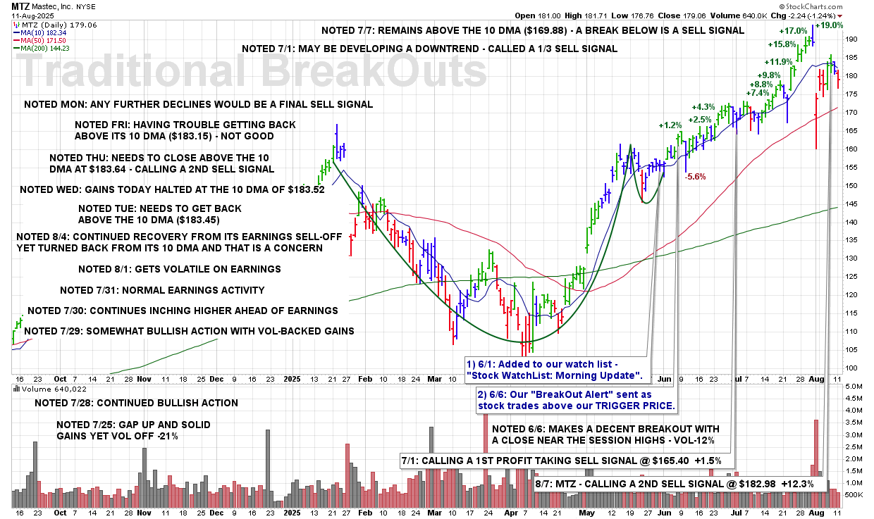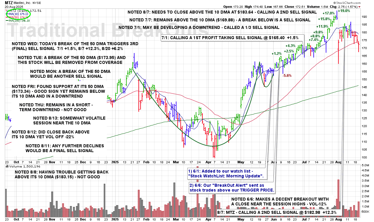 WED 8/20: MTZ – Today’s Break Of The 50 DMA Triggers 3rd (Final) Sell Signal – 7/1 +1.5%, 8/7 +12.3%, 8/20 +6.2%