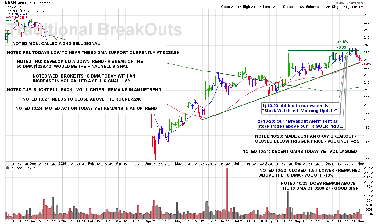 MON 11/3: NDSN – CALLING A 2ND SELL SIGNAL @ $228.13 -3.4%