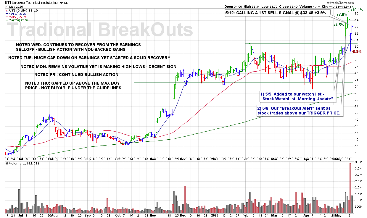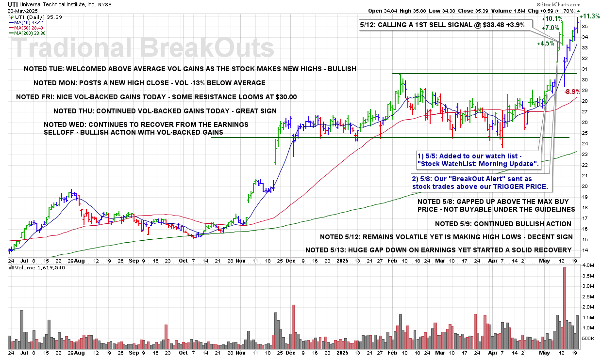 MON 5/12: UTI – CALLING A 1ST SELL SIGNAL @ $33.48 +3.9%