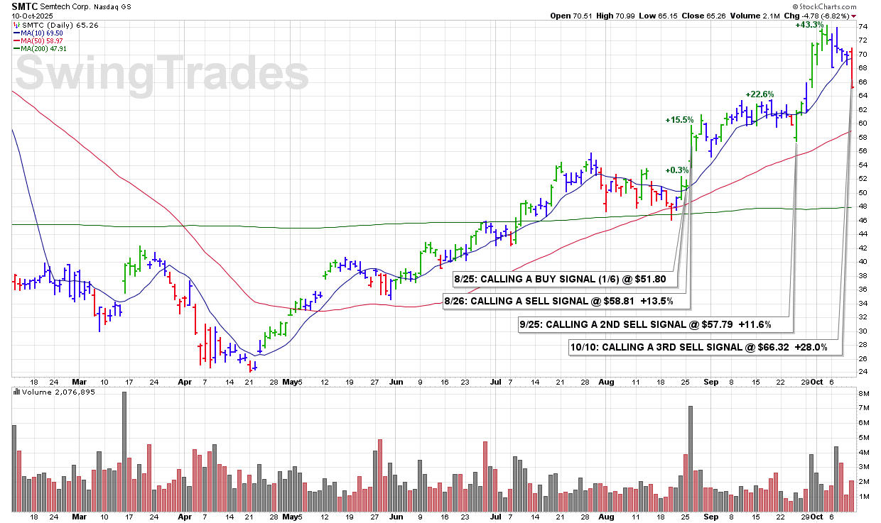 FRI 10/10: SMTC – CALLING A 3RD (FINAL) SELL SIGNAL @ $66.32 +28.0%