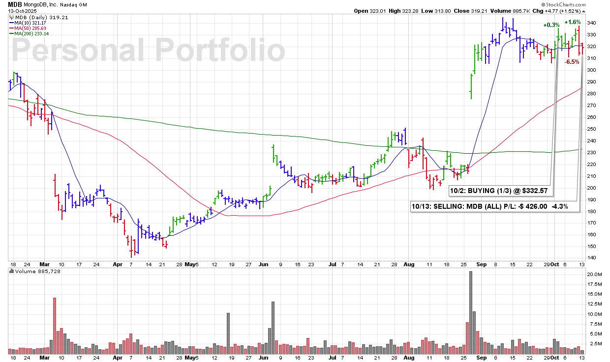 MON 10/13: MDB – SELLING (ALL) P/L: -$426.00 -4.3%