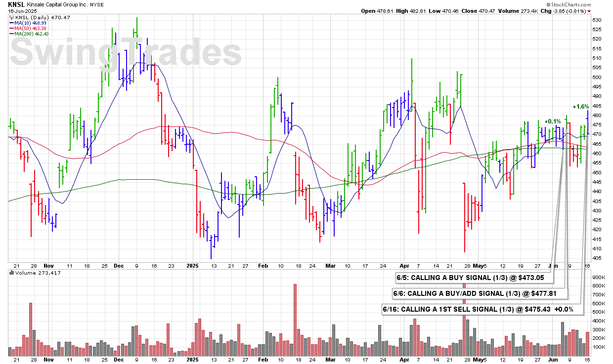 MON 6/16: KNSL – CALLING A 1ST SELL SIGNAL (1/3) @ $475.43 +0.0%