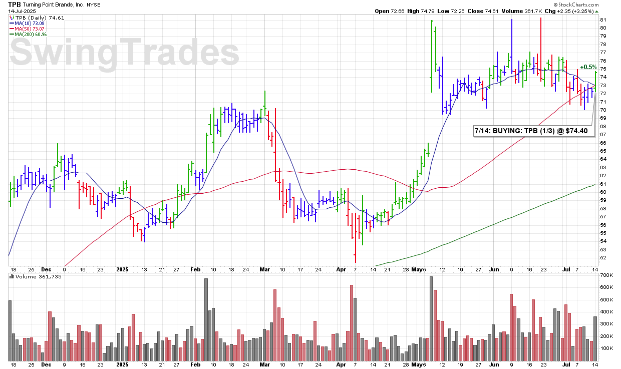 MON 7/14: TPB – BUYING: TPB (1/3) @ $74.40