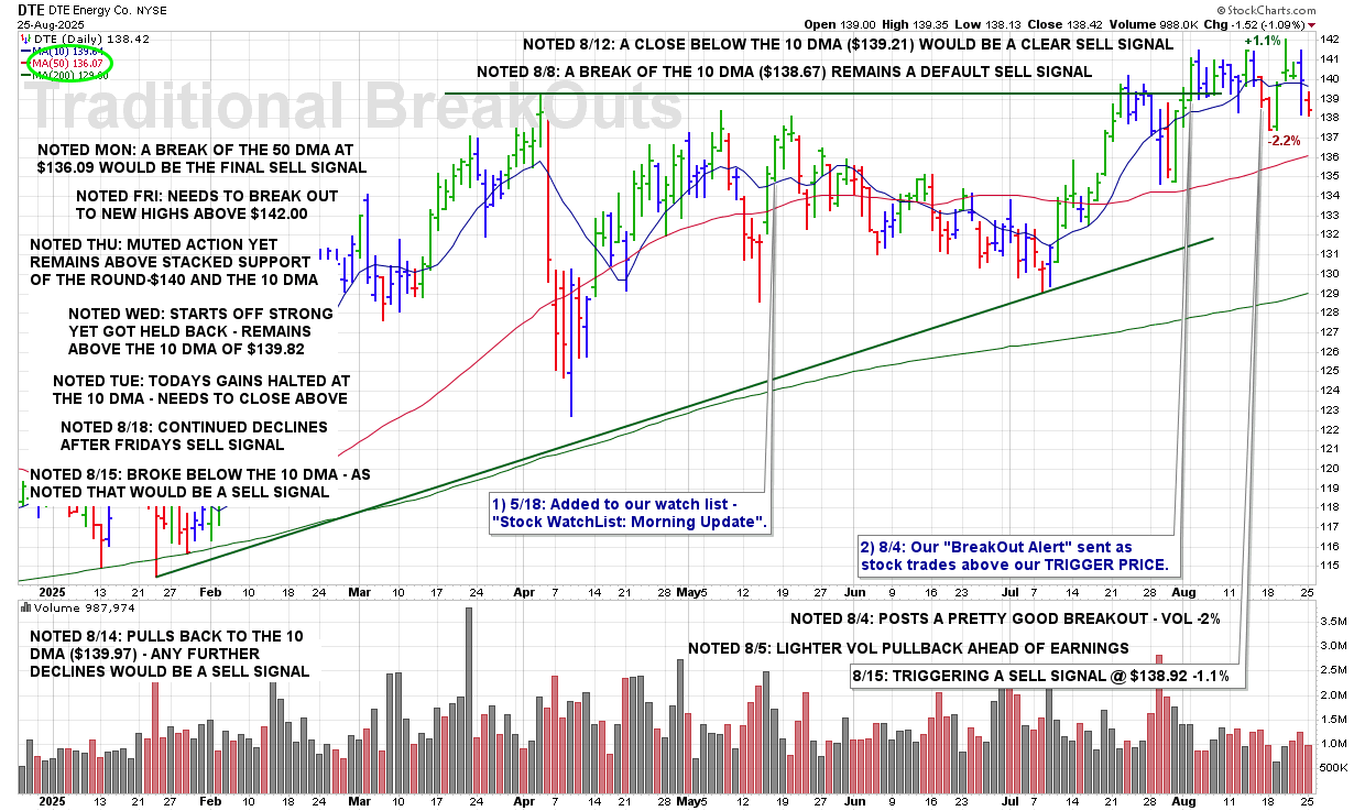 MON 8/25: DTE – A Break Of The 50 DMA At $136.09 Would Be The Final Sell Signal