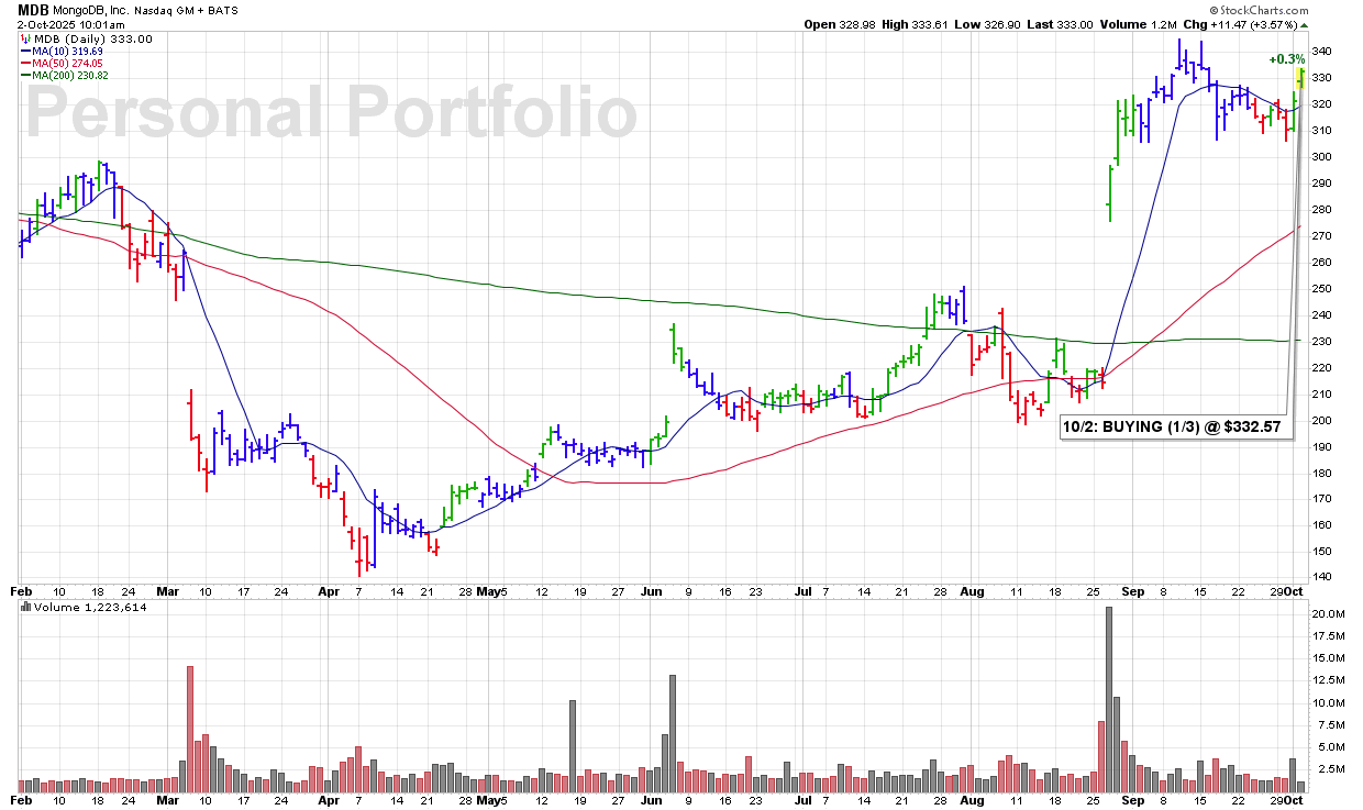 THU 10/2: MDB – BUYING (1/3) @ $332.57