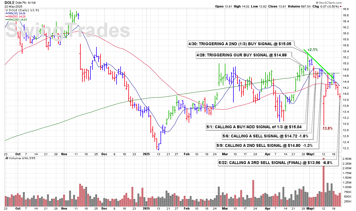 THU 5/22: DOLE – CALLING A 3RD SELL SIGNAL (FINAL) @ $13.96 -6.8%