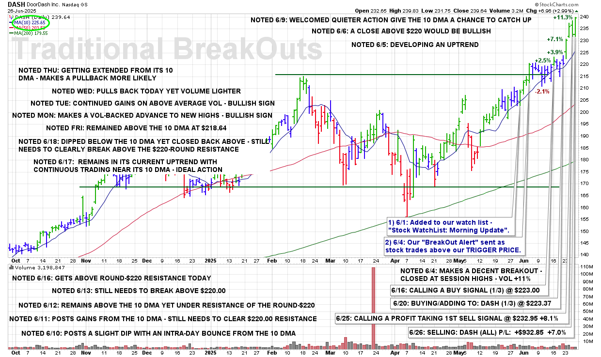 THU 6/26: DASH – SELLING: DASH (ALL) P/L: +$932.85 +7.0%