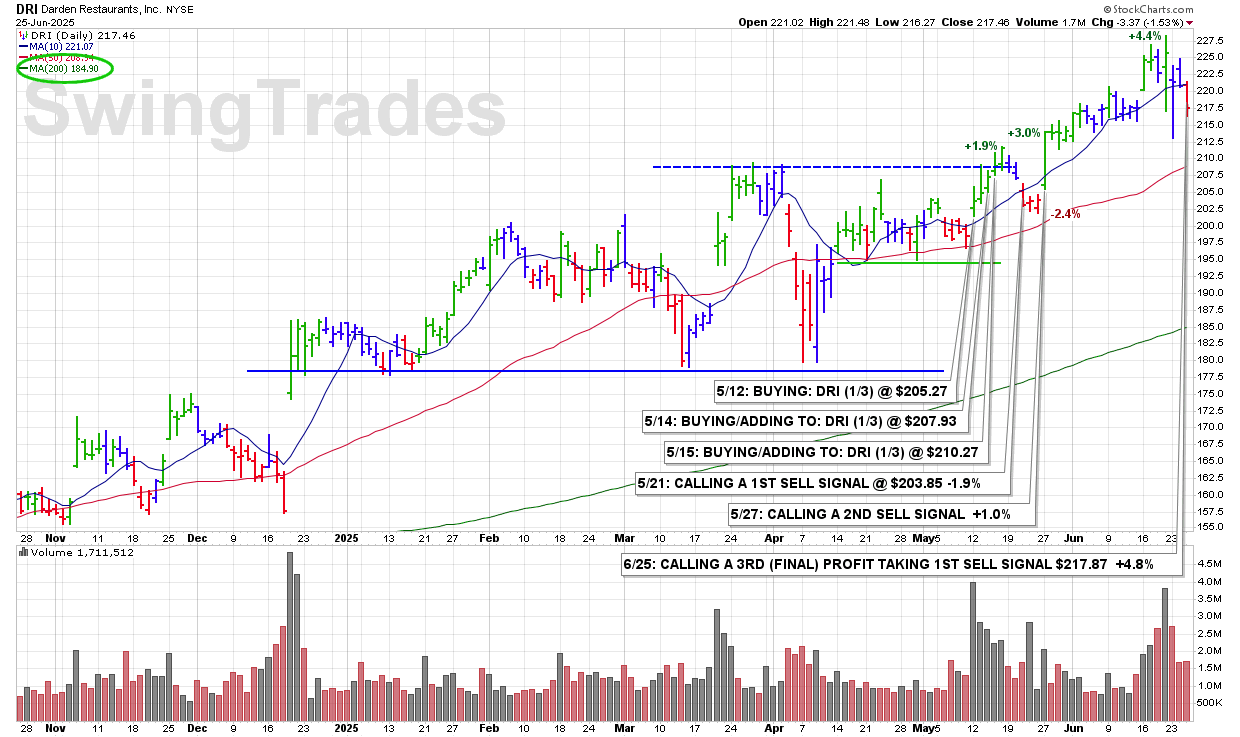 WED 6/25: DRI – CALLING A 3RD (FINAL) PROFIT TAKING 1ST SELL SIGNAL $217.87 +4.8%