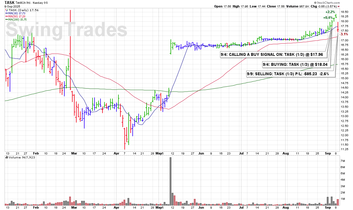 I sold 1/3 of my 1/3 position in TASK. A full position for me is $30,000, so I initially bought $10,000 on 9/4; today’s trim is 1/3 of that (~$3,333)—i.e., 1/9 of a full position.