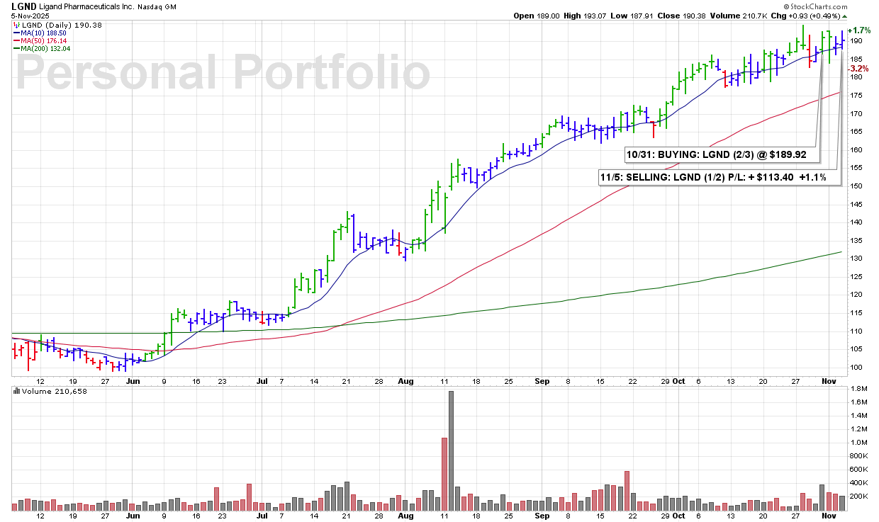 WED 11/5: LGND – SELLING (1/2) P/L: +$113.40 +1.1%