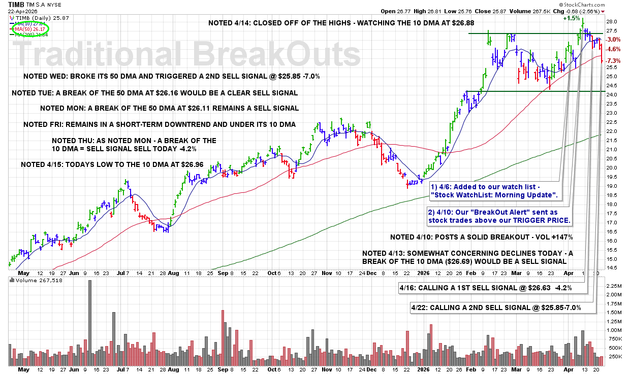 WED 4/22: TIMB – CALLING A 2ND SELL SIGNAL @ $25.85 -7.0%
