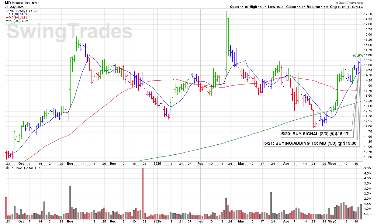 WED 5/21: MD – BUYING/ADDING TO: MD (1/3) @ $15.30